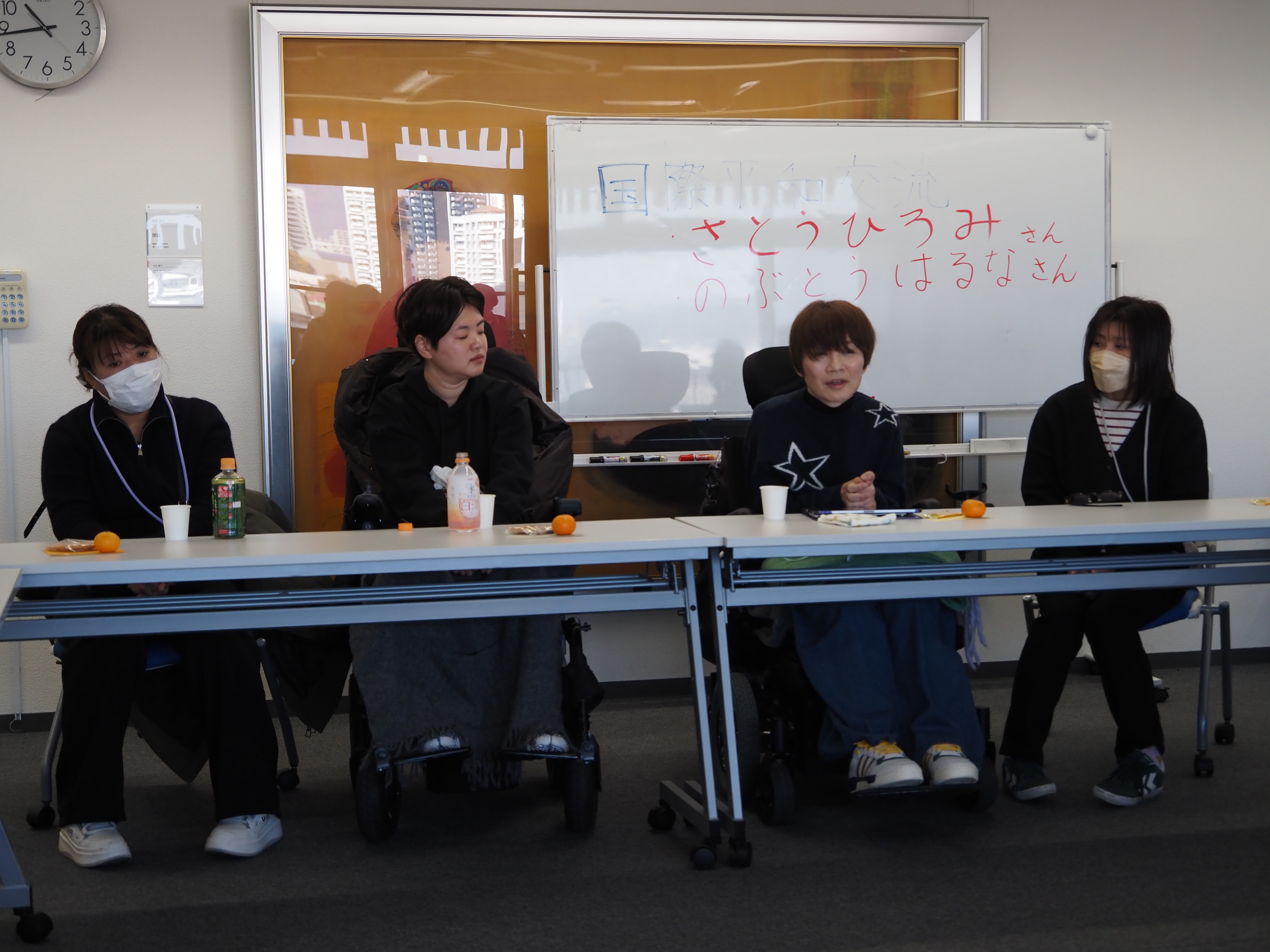 この日は東京から佐藤裕美さんとのぶとうはるなさんのお二人が電動車椅子に乗り、ヘルパーさんとともに東京からお話しをしにお越しくださいました。