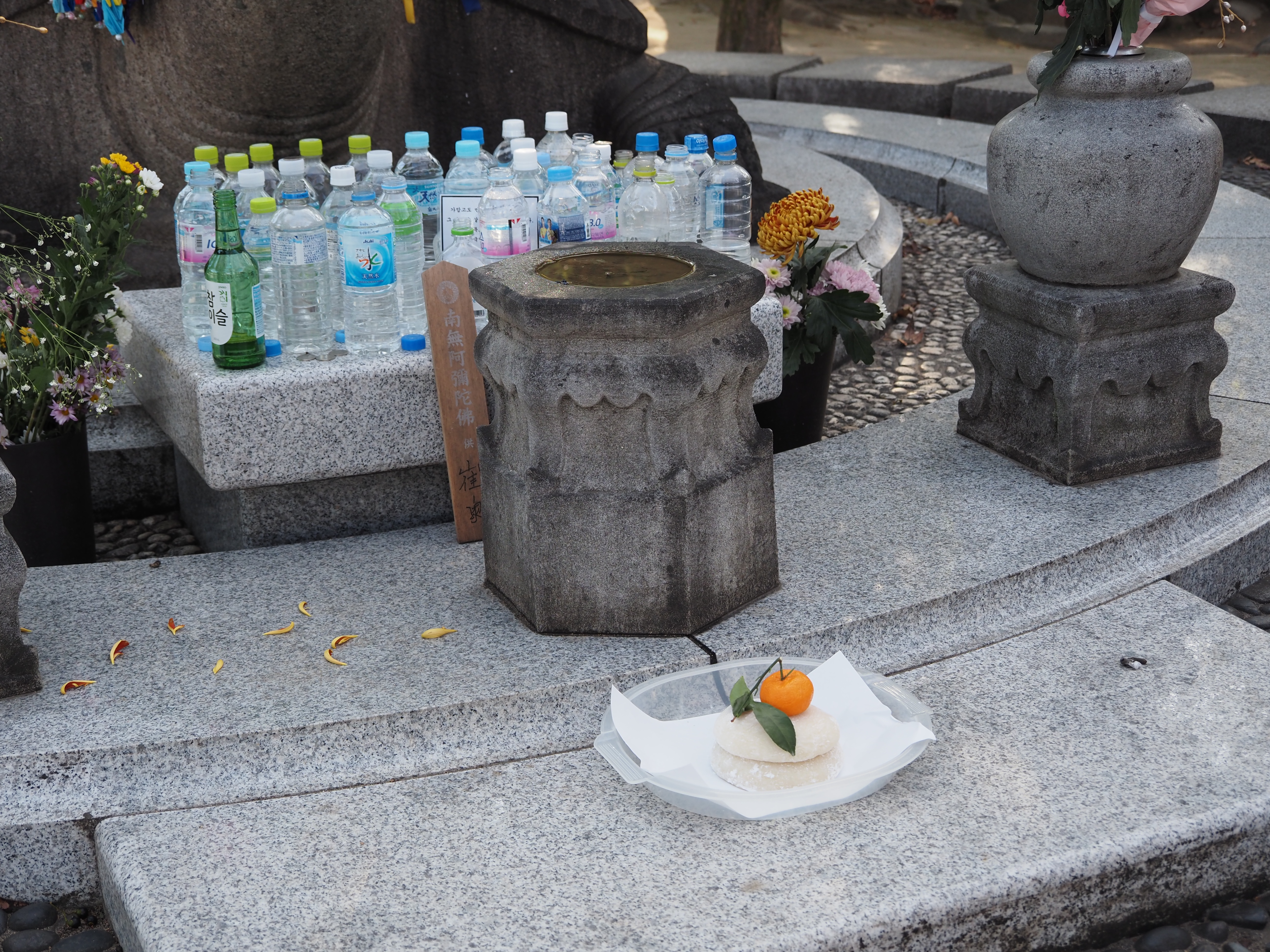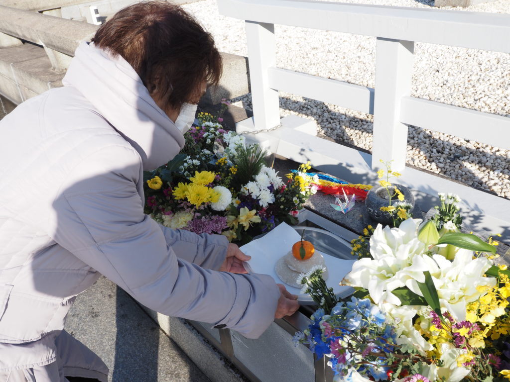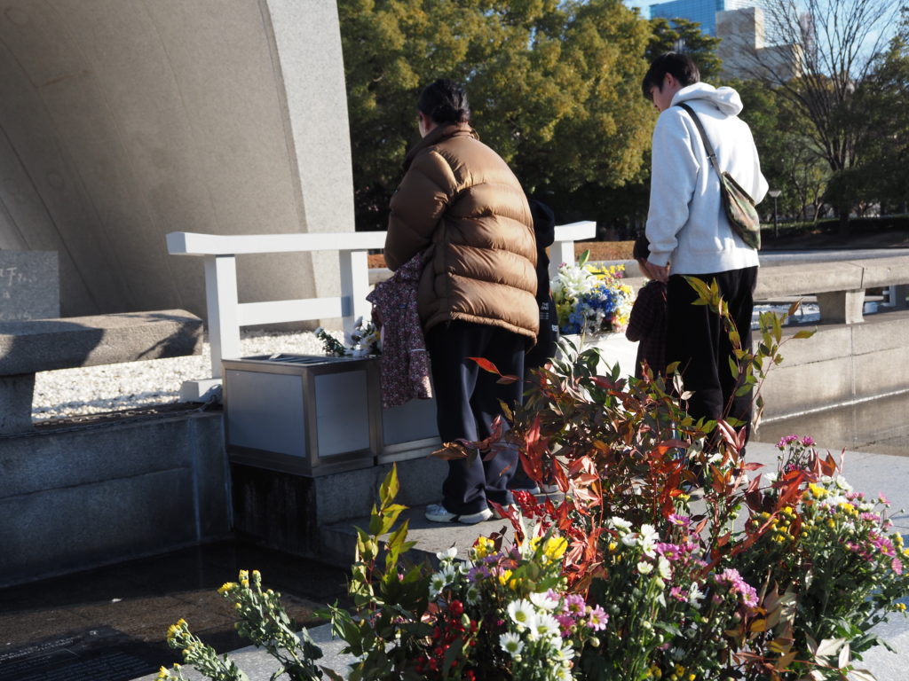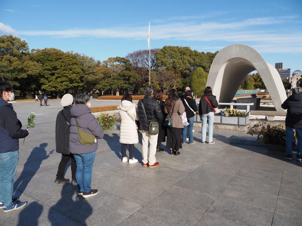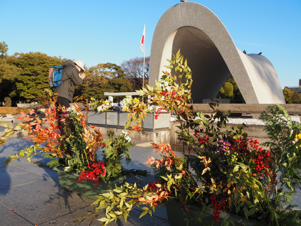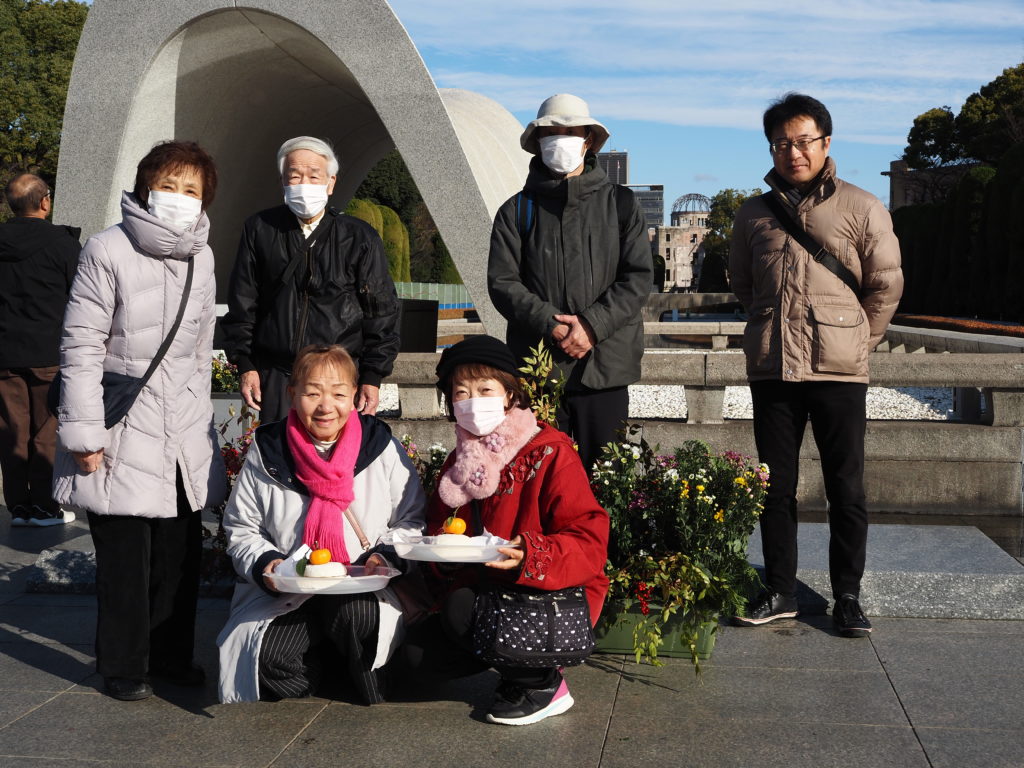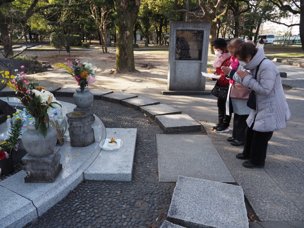 献花の後は、原爆慰霊碑、原爆供養塔、韓国人原爆犠牲者慰霊碑、この三か所に鏡餅をお供えさせていただきました。