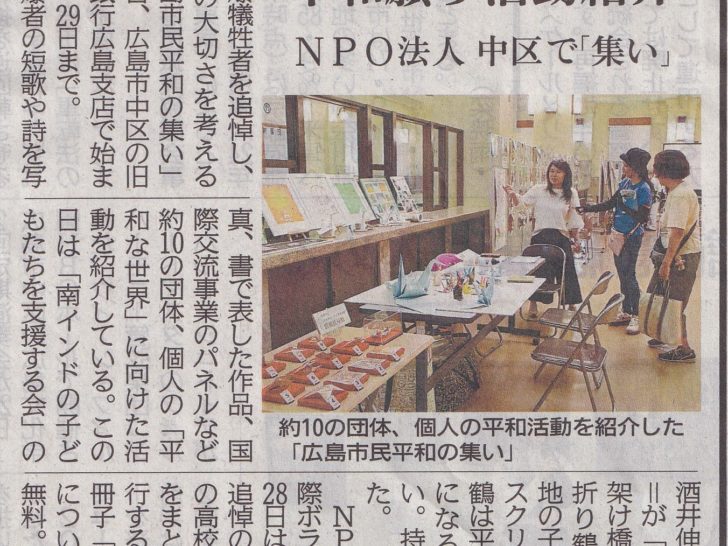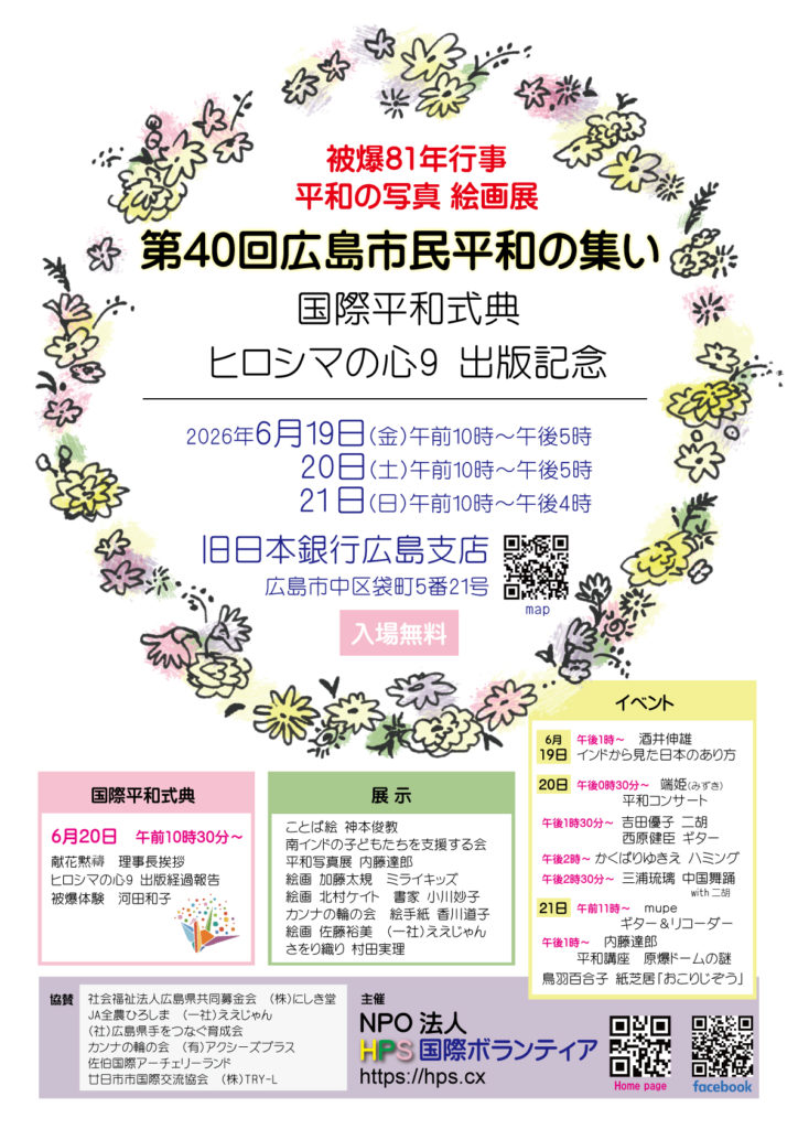 イベント2026.04.15第40回 広島市民平和の集い ご案内 2026年6月19日(金)から21日(日)の三日間、旧日本銀行広島支店にて第40回広島市民平和の集いを行います。 今回も前回同様、様々な展示やイベントを計画しております。 入場は無料です。 皆様方のご参加を心よりお待ちしております。 会場 旧日本銀行広島支店 前回 第39回 広島市民平和の集い