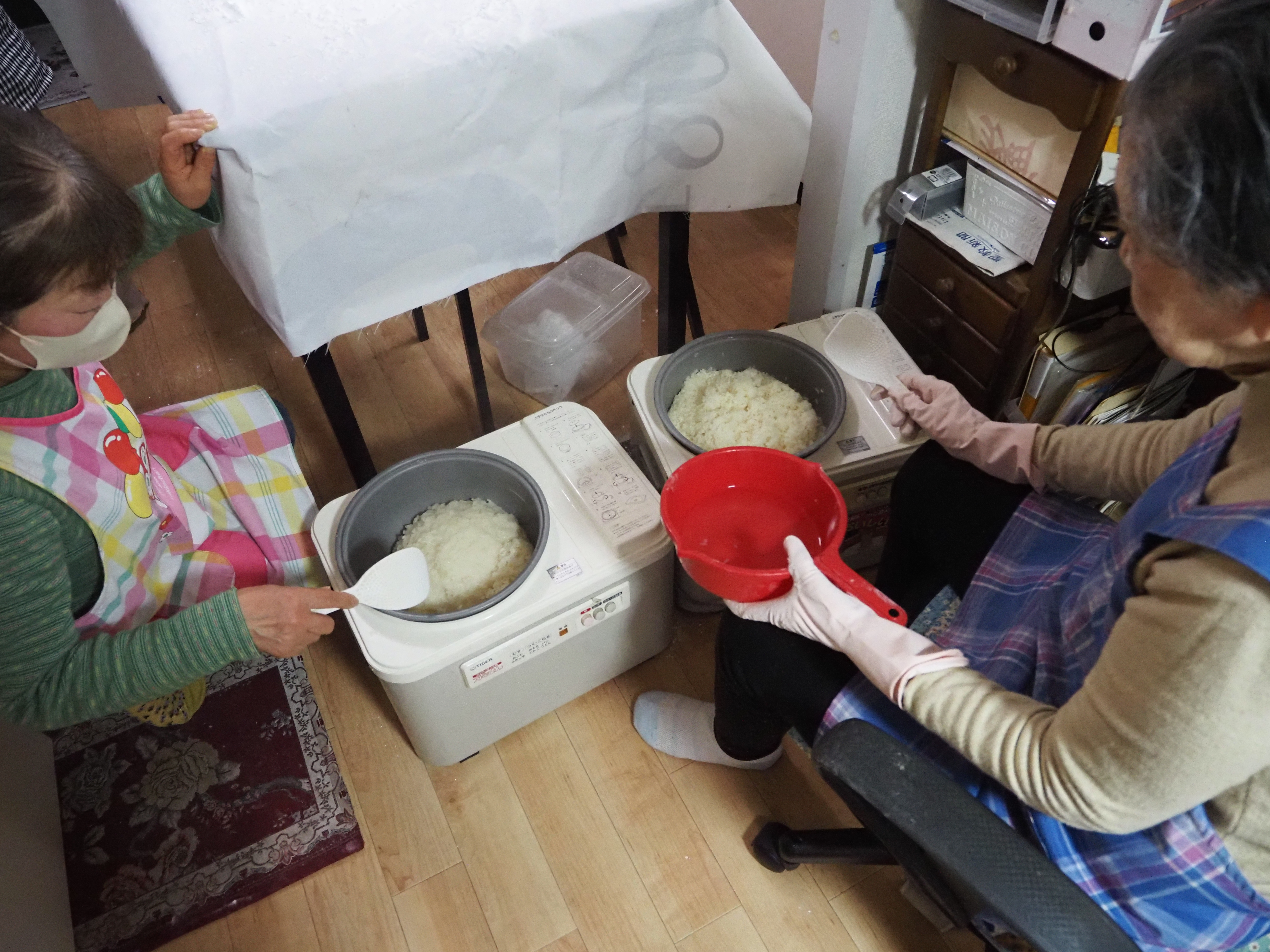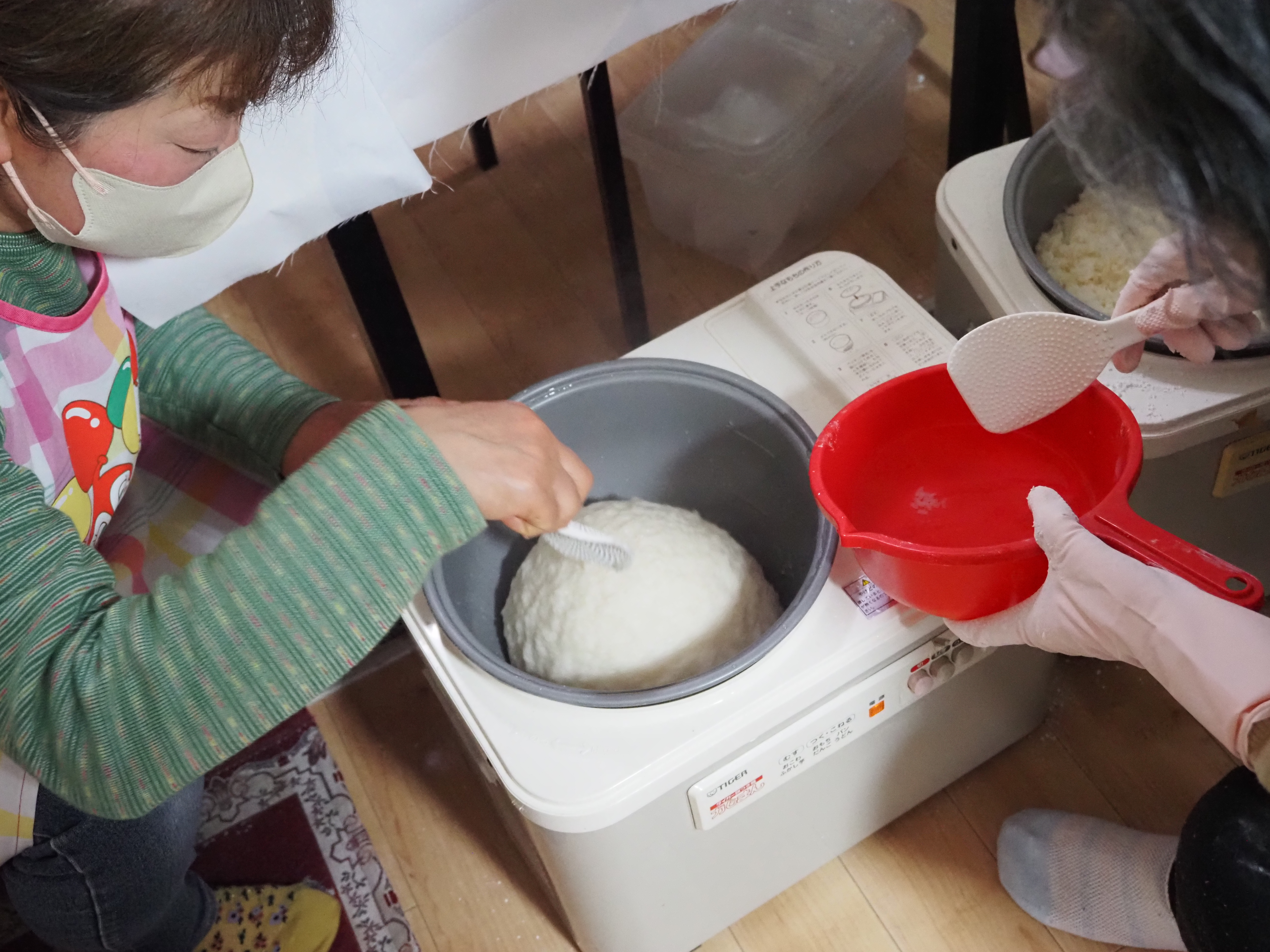 二台の餅つき機を使い、用意した11㎏の餅米を蒸していきます。
