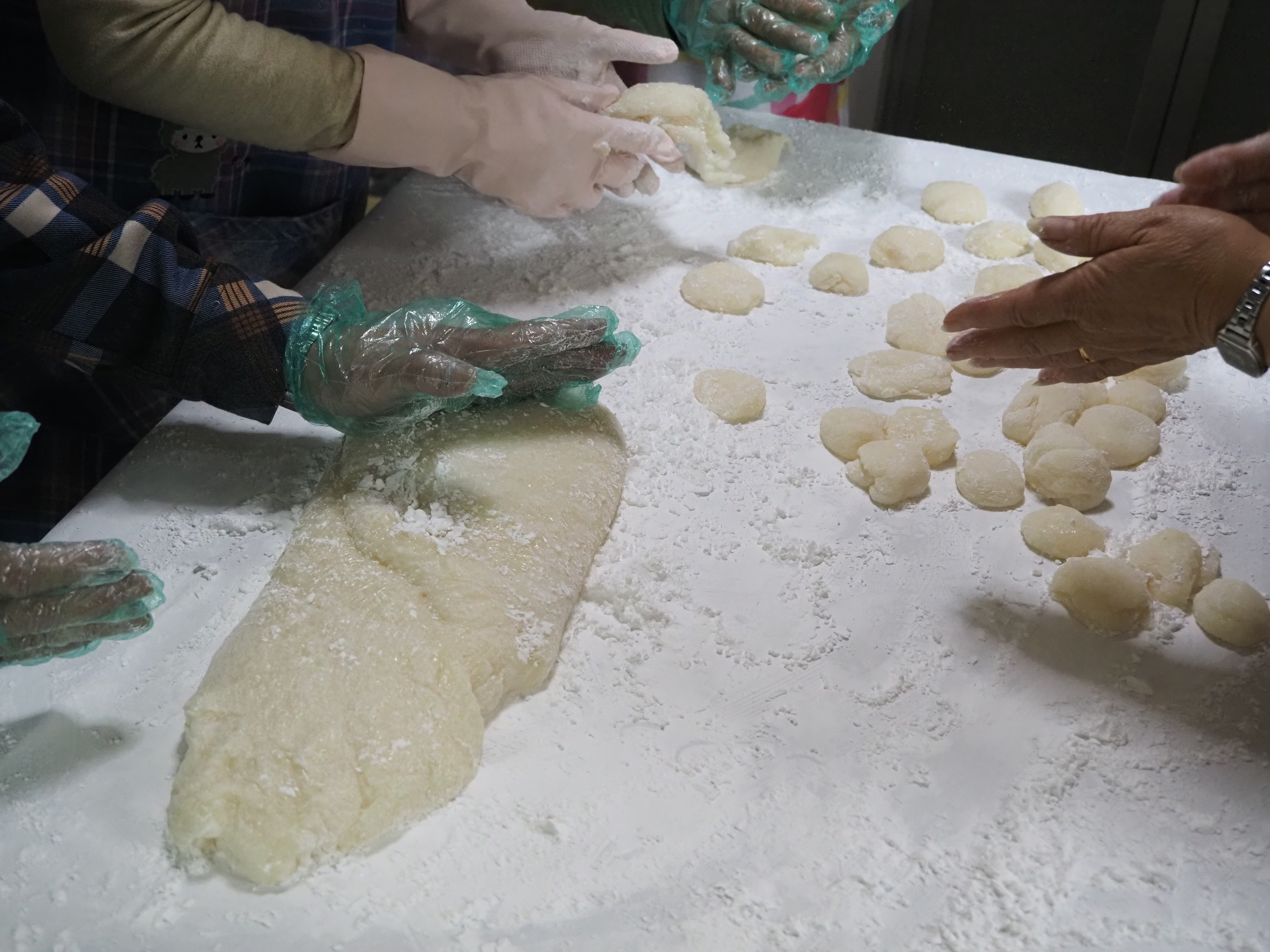 つきたてのお餅を途中きな粉餅や鮭を入れた三平汁にしていただきました。