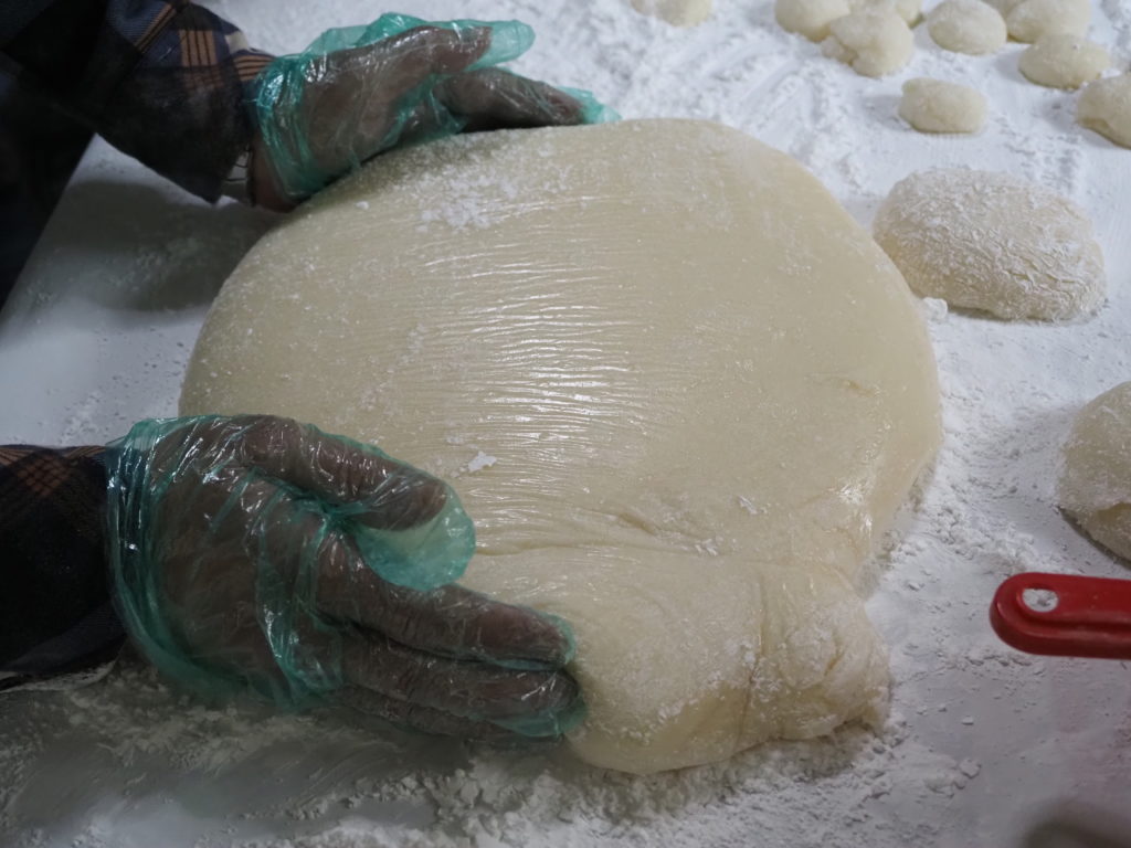 出来たてで熱々のお餅は、手早く切り分けて小餅や鏡餅などにしていきます。
