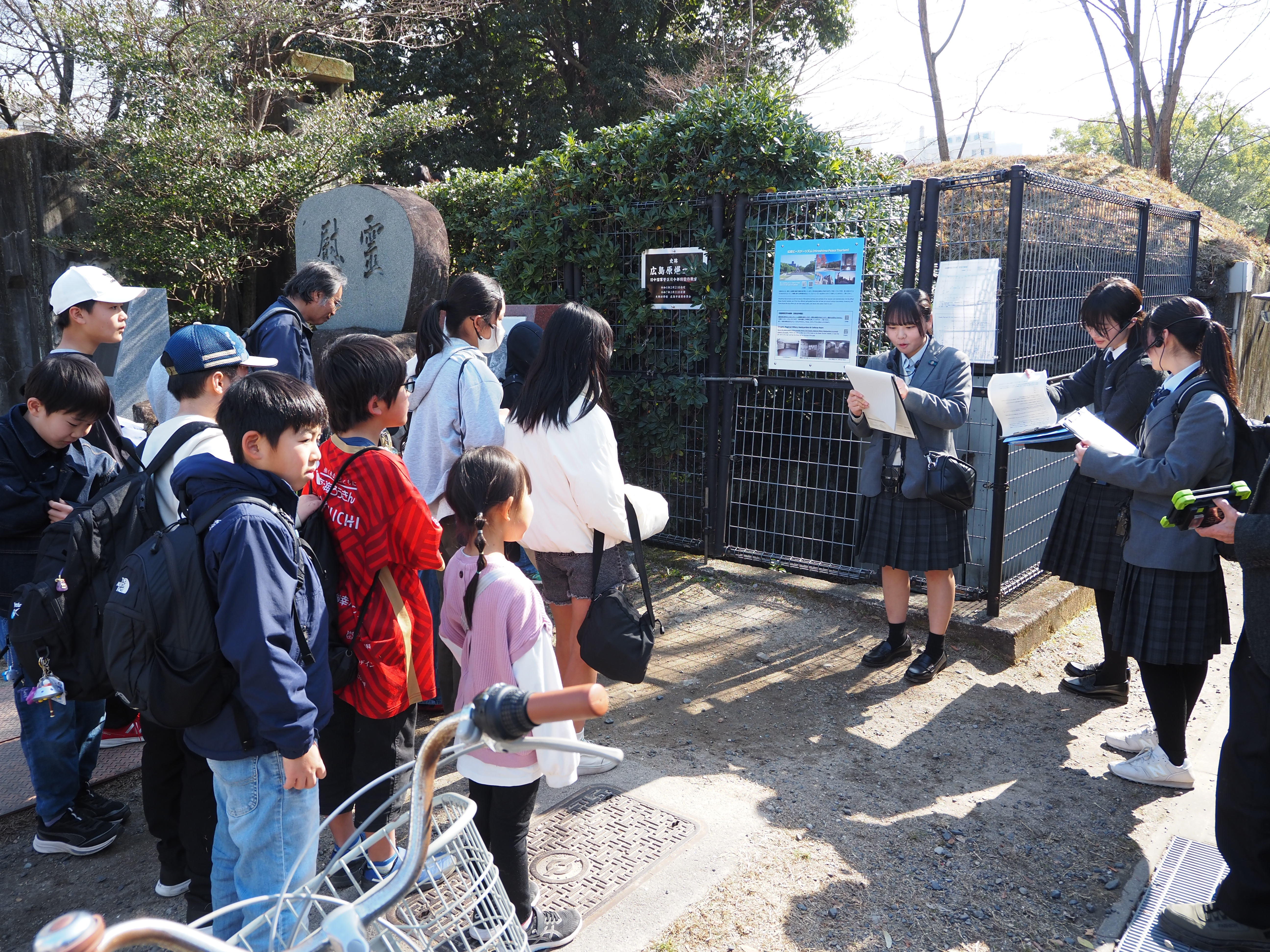 集まったのは広島城のすぐ南側にある護国神社前、ガイド役は市商の生徒さんが17名、ガイドしてもらう子どもたちは広島市安佐南区学区の小学生の子どもたち75名、そして先生や保護者の方たちです。
