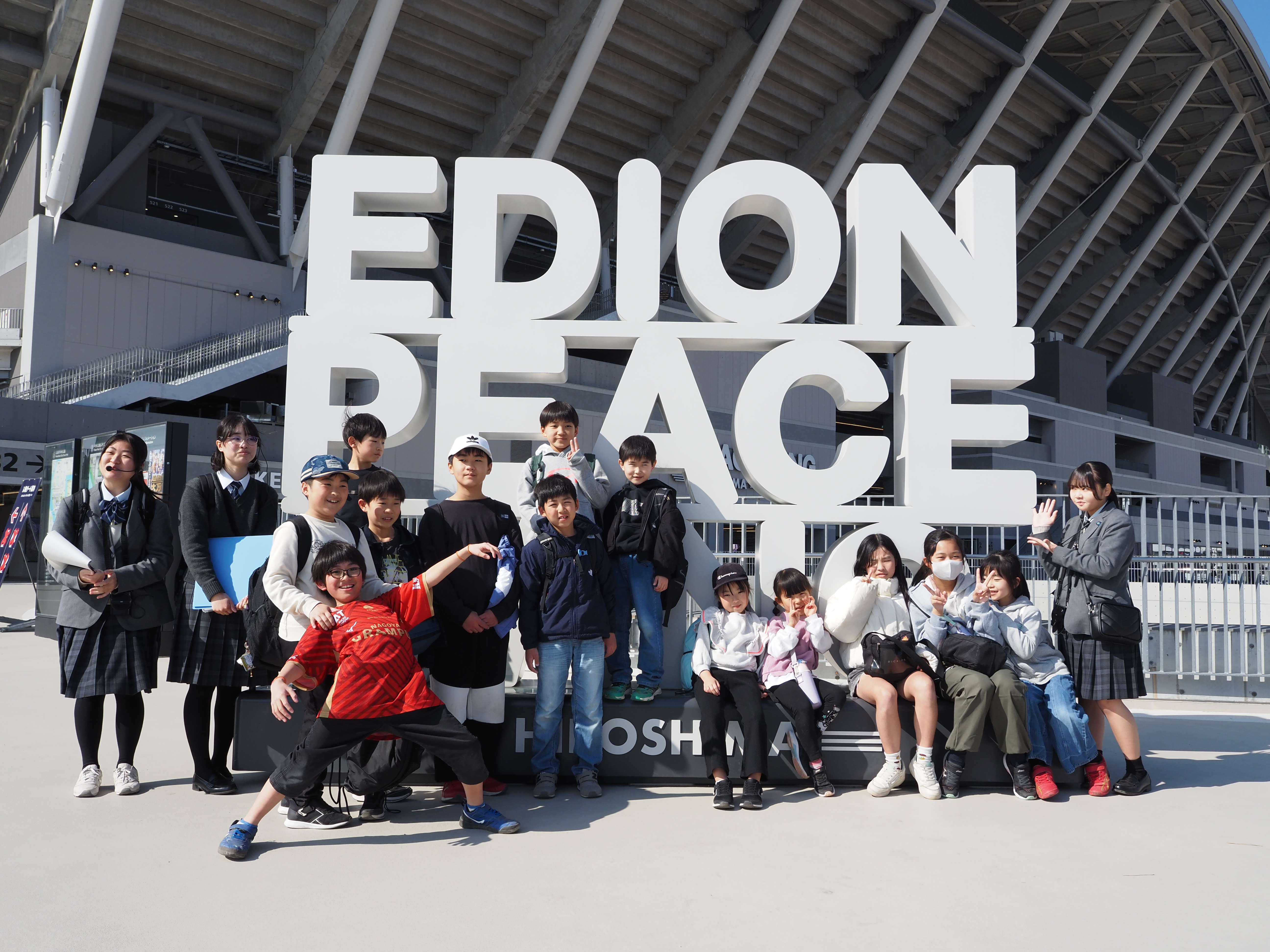 途中一昨年オープンしたエディオンピースウイング広島の前を通り、みんなで記念撮影です。